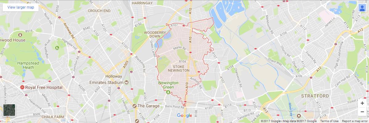 Unlike many districts in London, such as nearby Stamford Hill and Dalston, Stoke Newington has longstanding formal boundaries; but, like many areas, the informal understanding has changed over time. What is now considered Stoke Newington stretches further east, overlapping areas of the former ancient parish and then Metropolitan Borough of Hackney.