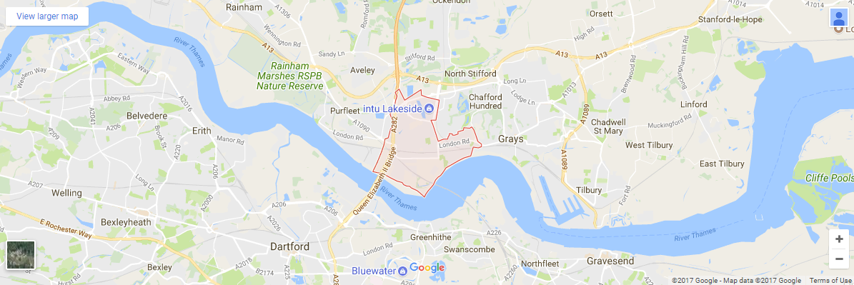 West Thurrock is part of the unitary authority of Thurrock located on the north bank of the River Thames about 17 miles (27 km) from Charing Cross, London.